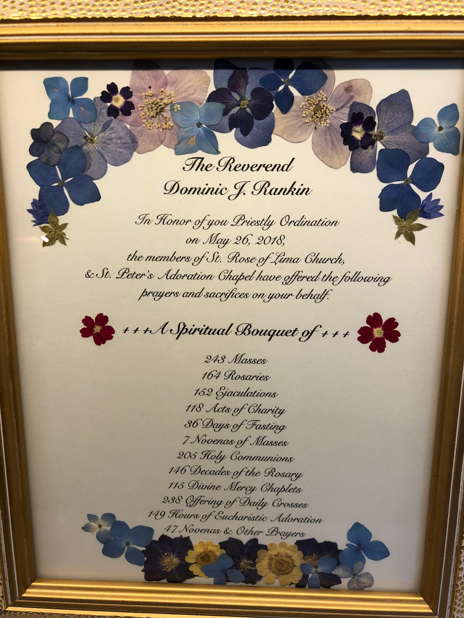 This is the spiritual bouquet that was given to Fr. Dominic Rankin. It was given to him at the reception dinner that we had for him in the parish hall following his Mass of Thanksgiving on Sunday.